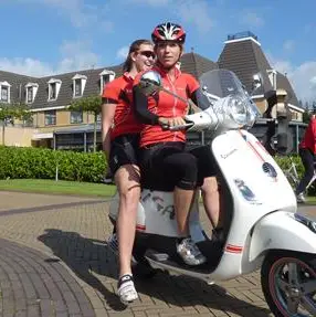 Met het trainen achter de Vespa zijn haar schaatssters in eerste instantie niet bezig. Allemaal willen ze eerst een rondje maken op de wit-rode scooter. Anice Das rijdt zelfverzekerd een rondje met Margot Boer achterop en ook Annette Gerritsen maakt meerdere ritjes over de parkeerplaats van het hotel.