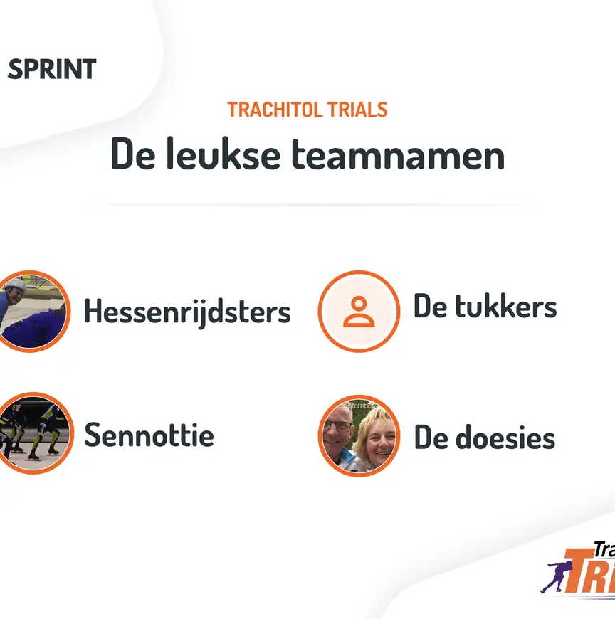 Ook dit jaar zijn de deelnemende teams erg creatief geweest met de namen. Zo zijn Sprinters Emma en Doke onderdeel van team Team Turbo. Meer leuke namen zie je in onderstaande afbeelding. Wil je alle teamnamen bekijken? Doe dan zelf mee in de Sprint app en bekijk alle teams in de Trachitol Trials ranglijst!