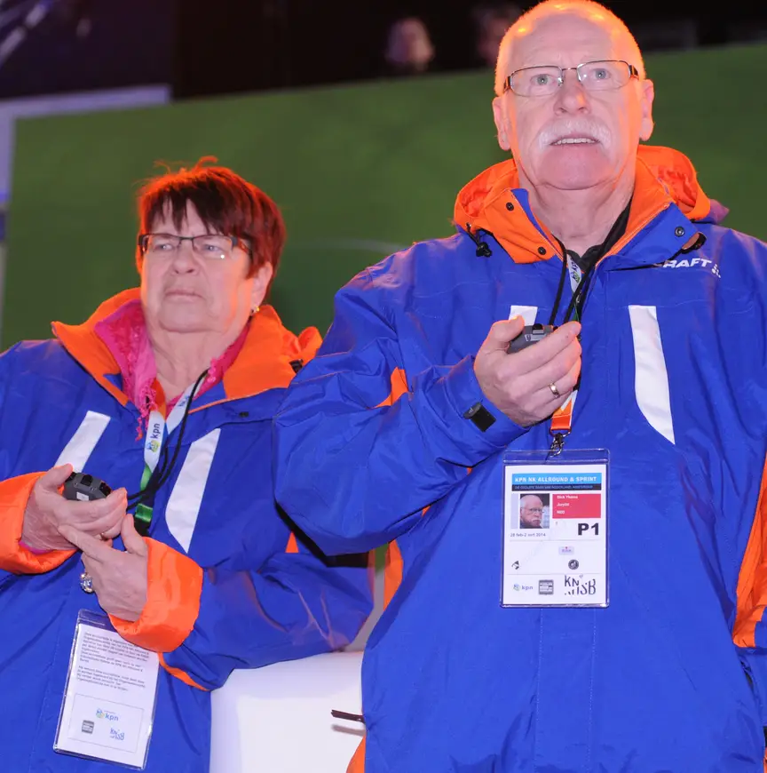 "Dat klopt, zoals tijdens het KPN NK allround/sprint in Amsterdam en ook wel op de ijsbaan in Utrecht. Het is niet mijn 'vaste' werk, maar je weet wel hoe zoiets gaat. Er is wel eens iemand afwezig of ik ben er toch. Mijn vrouw zit ook in het jurywerk. In Amsterdam deden we samen handtijdjury, dat doet ze ook al jaren. Maar het liefst is ze speaker bij wedstrijden."