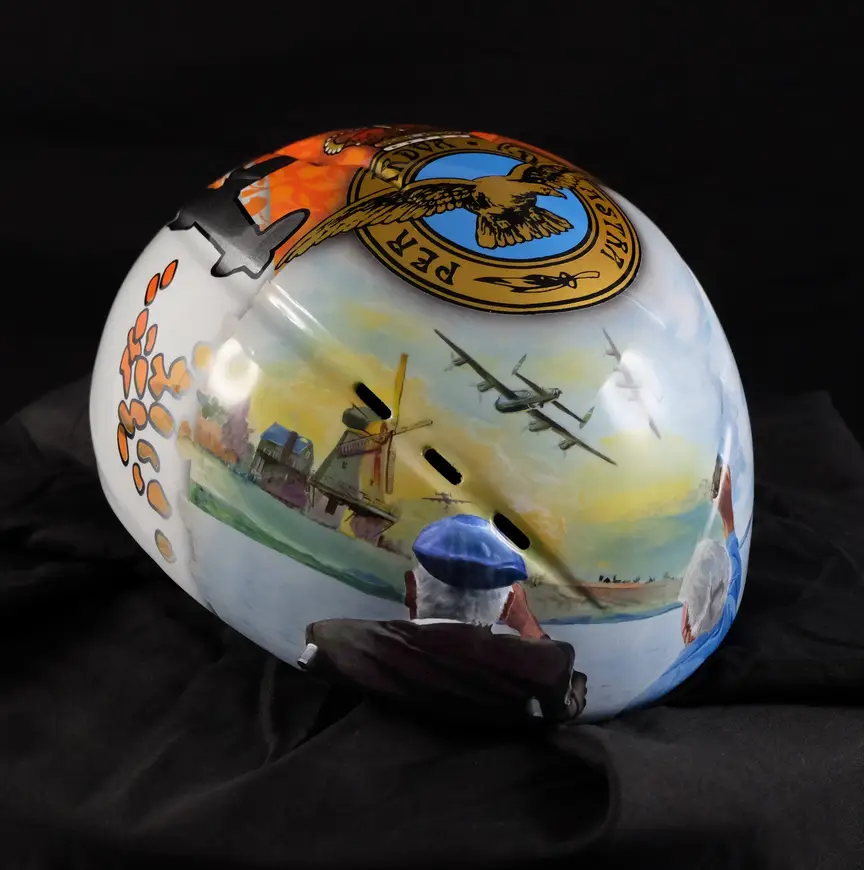 “Vond je dat een mooie helm? Zit een goed verhaal achter van een vrouw uit Engeland die me had benaderd. Haar man shorttrackt voor de lol en voor hem wilde ze als verjaardagscadeau een helm laten ontwerpen met iets van zijn opa. Die was in de Tweede Wereldoorlog piloot bij de Royal Air Force en raakte betrokken bij een beroemde voedseldropping boven Nederland waar destijds een hongersnood dreigde. Die vrouw stuurde een foto van die opa en oma waarop ze staan te zwaaien tijdens een vliegshow of zo. En er bestaat een schilderij van die dropping. Die twee afbeeldingen heb ik gefotoshopt en op de helm geschilderd, omdat het via airbrush niet was te doen. De rest eromheen is wel met airbrush gemaakt: het RAF-logo, de Nederlandse tulpen. Ik heb niet veel schilderijen vervaardigd, maar als je mij wat laat zien, kan ik dat reproduceren.”
