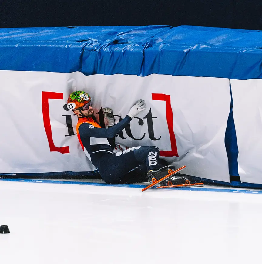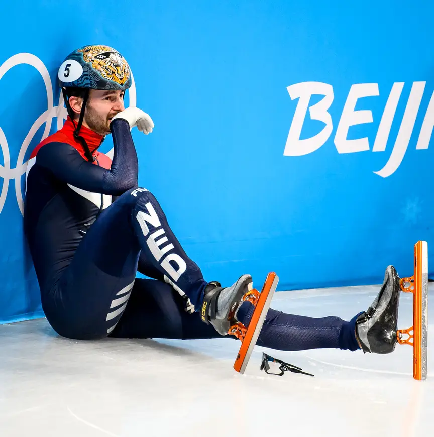 Dat is de eerste. De Laat heeft humor en veel zelfspot. De profielfoto van zijn WhatsApp is een afbeelding van hemzelf, verdwaasd overeind komend na een stevige crash op het ijs waarbij hij in de veiligheidskussens is beland. Maar als hij moet kiezen tussen een penalty of een crash? “Dat is een lastig dilemma voor een shorttracker. Dan zeg ik liever crash, want bij een penalty weet je zeker dat je laatste wordt. Crash je, dan kan het zo zijn dat iemand anders je onderuit heeft gekegeld. Lag je op een goede positie, dan is er nog kans op een advance (toevoeging aan de volgende ronde, red.). Een crash vind ik ook cooler, die kun je leuk op je Insta gooien. Of gebruiken op de WhatsApp, inderdaad. Soms zijn die stills (foto van een stilstaand beeld uit een video, red.) van valpartijen heel hilarisch. Zelfspot siert de mens, zeker in topsport wat zo serieus als wat is, mag dat best om de hoek komen kijken. Ik ben niet vies van wat zelfspot.”