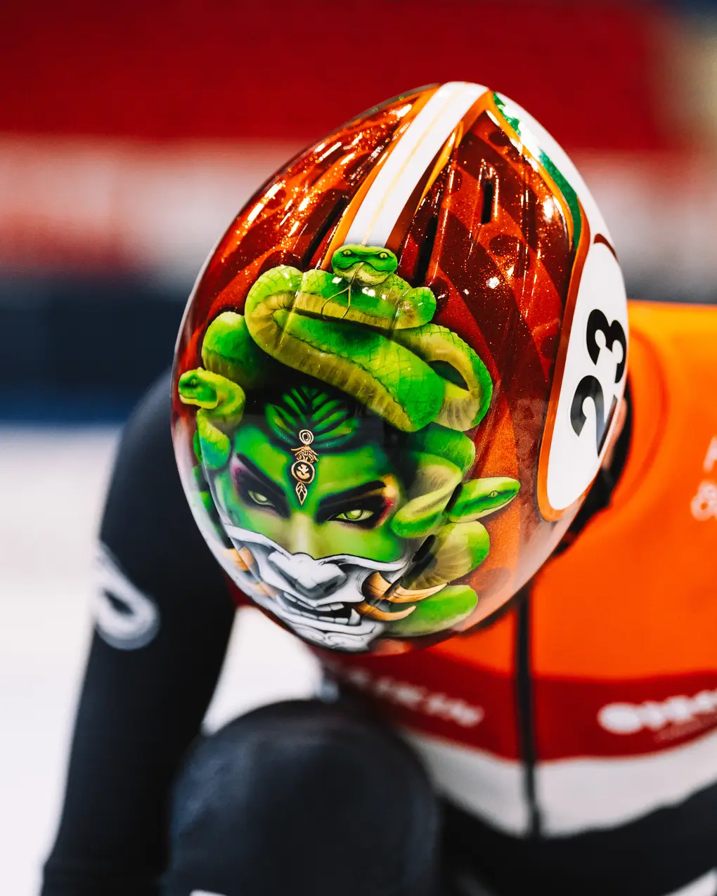 “Deze kan niet ontbreken. Op mijn oude helm, waarmee ik volgens mij drie seizoenen heb gereden, stond al een afbeelding van Medusa. Ik wilde dit jaar per se een nieuwe helm die next level moest zijn. Aan het begin van de zomer begon ik te brainstormen over het ontwerp, maar uiteindelijk is het opnieuw Medusa geworden. Ik kon geen beter idee bedenken voor mezelf. En Medusa, dat weet je, die staat voor de tegenstander in steen veranderen. Hij is prachtig geworden, de kleuren springen er echt uit. Ik heb van veel mensen complimenten gekregen. Vanaf nu moet er jaarlijks een nieuw Medusa-exemplaar komen, dat mijn trademark wordt.”