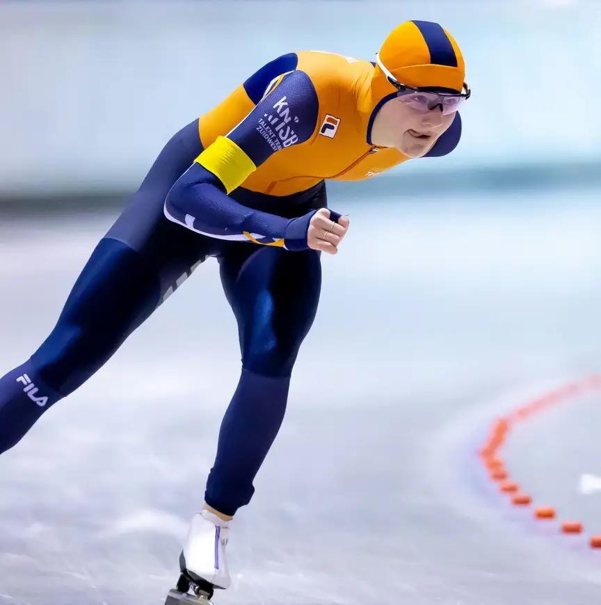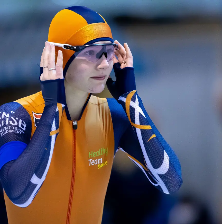 De 14-jarige schaatsster uit Leiderdorp is eigenlijk nog te jong om bij de B’s mee te doen, toch zou ze zelfs op het NK voor senioren niet misstaan. Haar tijden zijn van dusdanig hoog niveau dat ze regelmatig dispensatie krijgt om tegen oudere rijders te starten. “Zelf ben ik er eigenlijk nooit zo mee bezig”, vertelt ze echter. “Dat klinkt misschien stom, want het is wel bijzonder dat ik op zo’n jonge leeftijd al zo hard rijd. Ik bekijk meer per race hoe het gaat en realiseer me nooit echt dat het speciaal is.”
