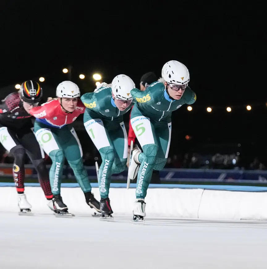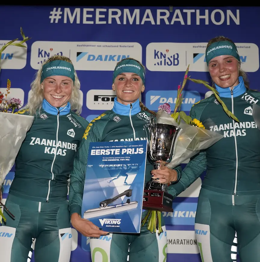Voor de goede orde, dat is sinds dit voorjaar Team Albert Heijn Zaanlander, het ‘nest’ van drievoudig olympisch kampioene Irene Schouten, of de razendsnelle Marijke Groenewoud – niet geheel toevallig de vrouwen die de eerste en tweede plaats bezetten na de eerste marathon van het seizoen. Van de promotie geniet ze elke dag: “Dit wilde ik, een stap hogerop, en dan is deze ploeg de enige waarin je je zodanig kunt ontwikkelen dat je verder kunt. Als marathonschaatsster, maar ik hoop ook op de langebaan”, aldus de Drentse die vorig seizoen namens PTH Groep actief was in de marathons.