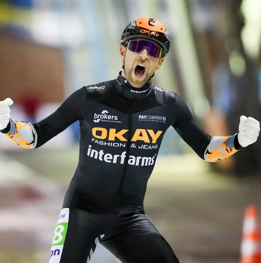 Ruud Slagter, de man in het oranje leiderspak, wist dit seizoen al een vierde en een tweede plaats te veroveren, maar stond nog niet op de hoogste trede. De nationaal kampioen bij de neo-senioren staat te boek als een goede sprinter en kon zijn snelheid ook op het Deventerse ijs goed kwijt. "Tijdens de race zat ik al drie keer kapot. Maar als ik het rondebord op vijf zie staan, gaat er mentaal een knop om en kan ik ineens nog een keer gaan."