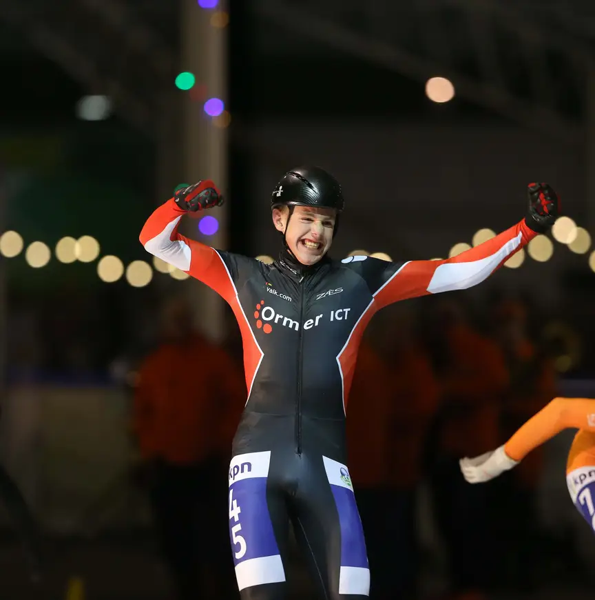 Precies dat deed Hoolwerf. Bij het uitkomen van de laatste bocht schoot hij achter Hoekstra weg. ’’Daarna moest ik echt vol gas geven om bij hem te kunnen komen’’, vertelde Hoolwerf. ’’Pas op de laatste meters kwam ik naast en voorbij hem. Het scheelde echt niet veel.’’
