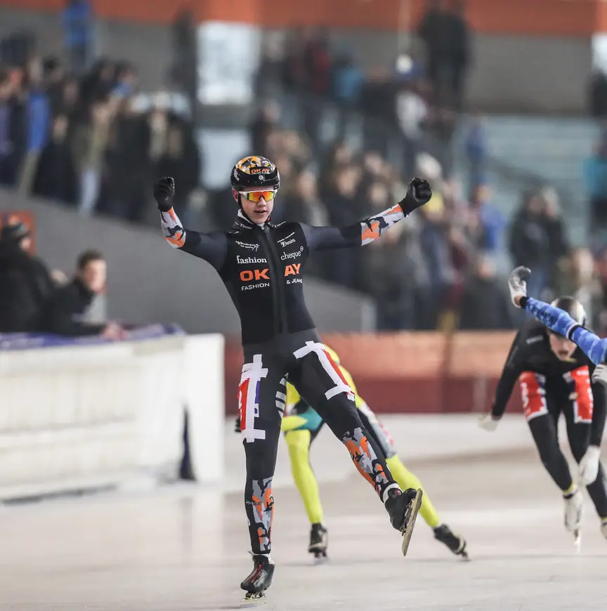Hoolwerf kon er mee omgaan. Had ook geleerd van het NK op het kunstijs van Thialf. ’’Daar reed ik bij de Neo’s achter de feiten aan en dat wilde ik nu niet laten gebeuren. Ik moest zorgen dat ze achter mij aan reden, dat is meer in mijn voordeel.’’