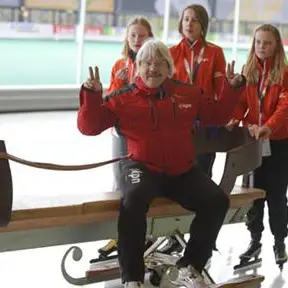 Op een enorme houten doorloper werd Tjaard Eisses vanmiddag het ijs van de Vechtsebanen over getrokken waarna hij in de bloemetjes werd gezet door o.a zijn oud pupil Erik Bouwman die bekende dat het vroeger als junior in Groningen een doel op zich was om tot 'De Bende van Eisses' te behoren.