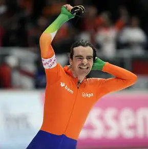 Bob de Jong viert zijn overwinning in Inzell