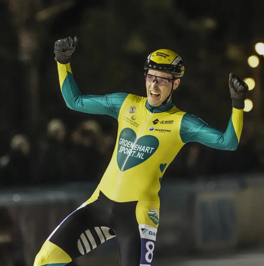 De indrukwekkende triomftocht roerde zijn gepassioneerde ploegleidster Linda Bouwens tot tranen toe. Terwijl zijn trainingsmakkers van Sportchalet Viehhofen, uitkomend in de Topdivisie, hun bewondering op luidruchtige wijze deelden met iedereen die het wilde horen, stond de ex-marathonrijdster te bekomen van deze ‘aardschok’. Ze beaamde wat de mannen van haar ploeg beweerden, namelijk dat ‘deze zege er al twee jaar aan zat te komen’. “Dat klopt wel. Als ik terugdenk aan ons trainingskamp in de zomer, zie ik een enorm sterke schaatser. Maar dat hij hier twee rondjes voorsprong grijpt op de meesten, had ik niet verwacht. Ja, ik word hier wel geëmotioneerd van”, erkende ze nog eens, ondertussen de waterlanders weer uit haar ogen wrijvend.