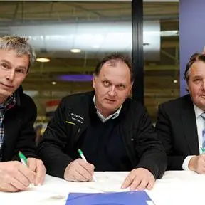 Directeur Sport KNSB Arie Koops, ijsbaandirecteur Herbert Krabbe en Ritzo Bloem (directeur ROC Twente voor Dienstverlening en Gastvrijheid) zetten hun handtekening.