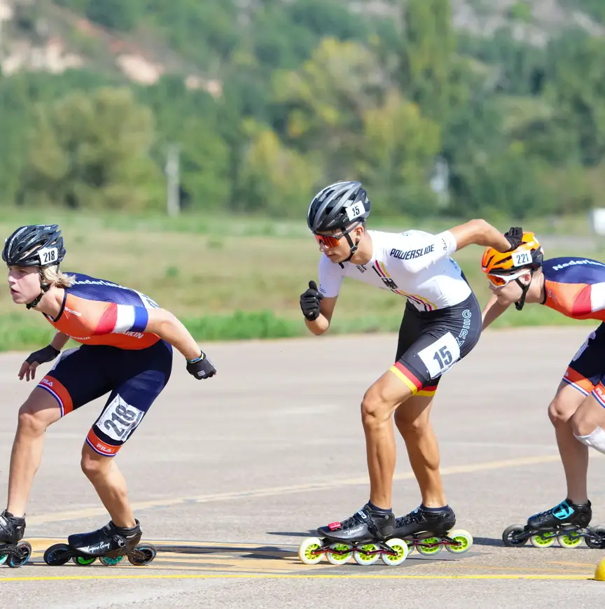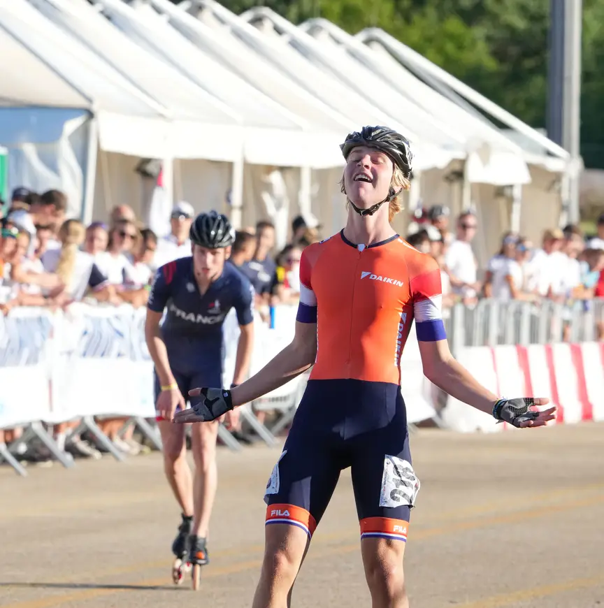 Daar zat Berkhout dan, met zijn goede benen die hem eerder naar een hoofdprijs op de piste in L’Aquila hadden gedragen. “Ik kon niets meer doen, moest wachten totdat die mannen zouden worden teruggepakt. Al vraag ik me af of ik in die fase van de wedstrijd al zo diep had moeten gaan door mee te springen. Ik moet het normaliter hebben van het tweede deel van een koers, oftewel: het is beter mijn kruit droog te houden tot voor de finale”, vertelde hij. Daarnaast was het zaak de wielen te sparen waar hij kon. Daarom skeelerde hij een halve koers ‘op glas’. “Superzuinig rijden, omdat je de wielen zo hard nodig hebt. En wanneer ze te vroeg afslijten – wat op dit rondje heel erg snel gebeurt – kun je tegen het einde geen kant meer op.” Of juist alle kanten, ’t is natuurlijk maar hoe je het bekijkt…