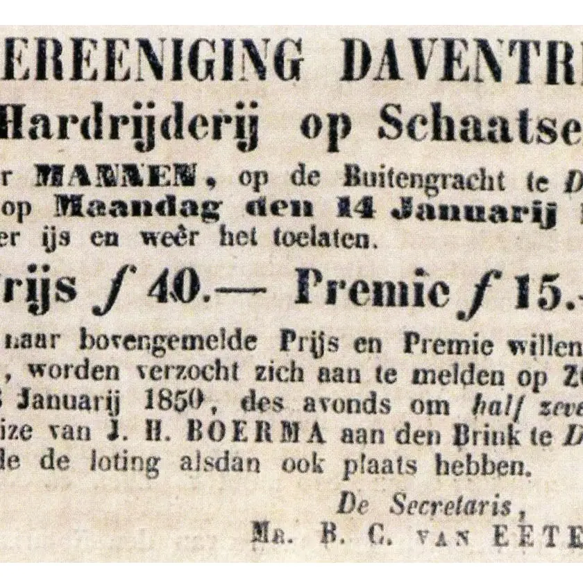 Recent onderzoek door schaatshistoricus Ron Couwenhoven wijst uit dat ijsclub Daventria de eerste ijsclub in Nederland was. In de winter van 1849-1850 trad men ook onmiddellijk als ijsclub naar buiten via een advertentie in de Provinciale Overijsselsche Courant, waarin voor 14 januari 1850 een hardrijderij voor mannen werd aangekondigd.