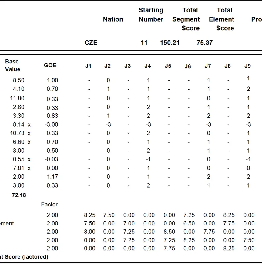 De tweede scorelijst van Michal Brezina is die van de Nebelhorn Trophy van dit weekeinde. We zien dat elk jurylid nu een kleiner stukje werk heeft gekregen in plaats van zoals in Skate Canada, waar elk jurylid zowel de uitvoering van de technische elementen als alle vijf de program components moest intoetsen.