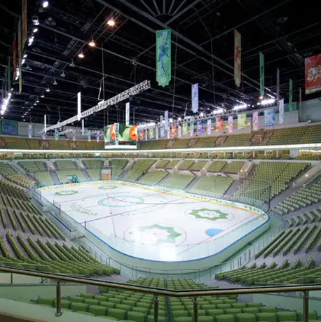Maar ja, niet een locatie voor een lang weekeindje in de woestijn, waar het merendeel van het land uit bestaat. In no-time werd het team bij elkaar vergaard, ook een aantal ouders gingen mee, en nu nog visa en voor sommige schaatsers paspoorten regelen. En aldus vertrok het team een week later naar Ashgabat. Aldaar trof onze delegatie een prachtig complex aan dat gedeeltelijk uit goud opgetrokken was, met ook nog een trainingsbaan ernaast.