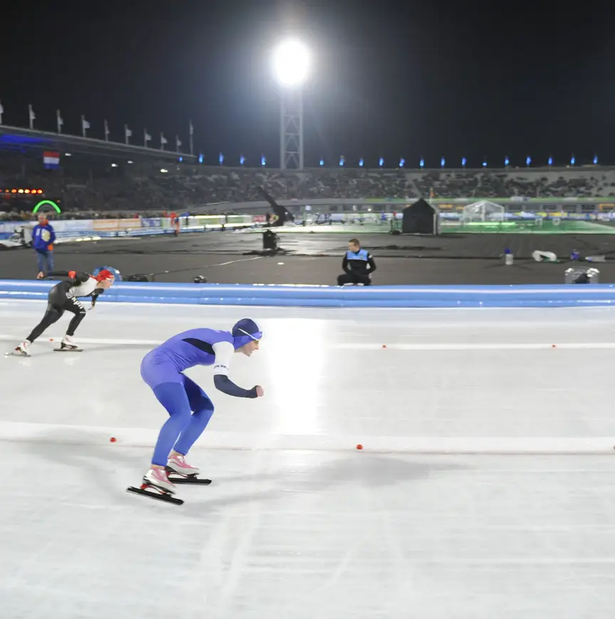 Het schemerde en de immens hoge lichtmasten gingen aan. Het maakte de sfeer nog intenser. Kijkend naar de schaduwen die de rijders vooruit gleden, zag ik mezelf plots als tienjarige in volle vaart over het ijs van de Jaap Eden-baan snellen.