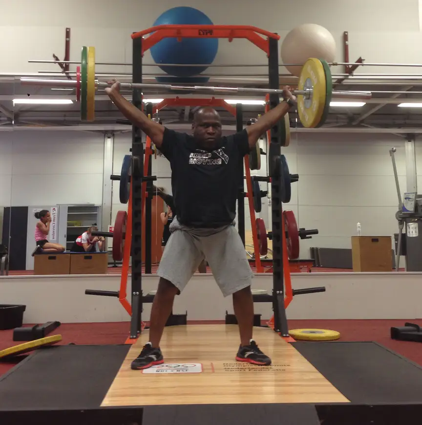 Ok, ik heb de stang goed vast. Mijn voeten staan goed, met de tenen een beetje naar buiten. Nu moet ik gaan zitten in de starthouding. Dio roept nog: “Houding. Houe dicht bij je lichaam. Oh ja, rug recht. En waaaahaam!”
