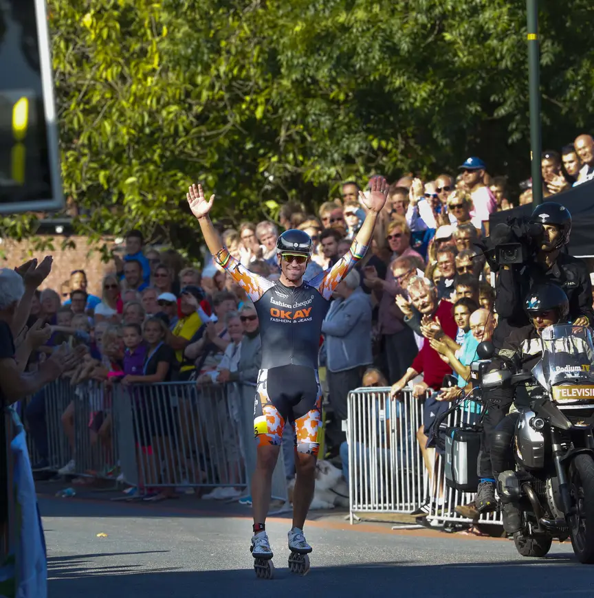 Zijn vrouw en kindje hebben de wedstrijd thuis via de livestream kunnen volgen. “Dat is hartstikke mooi, ik had ze net nog even aan de telefoon.” Van Ariëns mag die livestream en een soortgelijke wedstrijd trouwens vaker plaatsvinden. De mannen uit het skeelerpeloton leggen als training door de week vaak duurritten van negentig tot honderd kilometer af, terwijl het in wedstrijdverband vaak bij veertig kilometer blijft. “De wedstrijd van vorige week in Puttershoek was er een van zeventig kilometer, maar anders was dit de enige lange koers geweest”, besluit hij. “Dit was een supermooie wedstrijd. Zo mogen ze van mij vaker gereden worden.”