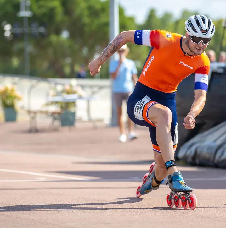 10.35 uur: Op de achtergrond kijkt Hempenius toe hoe de andere heats afgewerkt worden. Er wordt knalhard gereden door de andere mannen. De tijd van Hempenius is voldoende om door te gaan naar de halve finale. Hij kwalificeert zich als vijfde. In de halve finale wacht met vice-wereldkampioen Alessio Piergigli een taaie klant