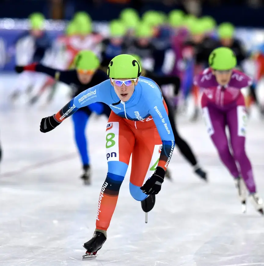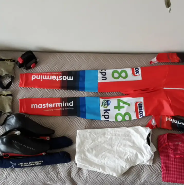 Dan ook nog snel een fotootje van mijn kledingpakket voor het NK Mass Start. Na een paar ernstige ongelukken in het verleden met ernstige snijwonden tot gevolg rijden we nu allemaal in snijvast materiaal op de vitale delen. Een witte snijvaste broek, enkelsokjes, handschoenen. In mijn pak zit een snijvaste kraag en snijvaste delen op mijn armen. Een goede zaak, vind ik! Ook de helm is sinds vorig jaar verplicht. Daar merk ik tijdens het rijden helemaal niks van. Laatste attribuut: een stel vlijmscherp geslepen schaatsen! Check. Ik ben er klaar voor!