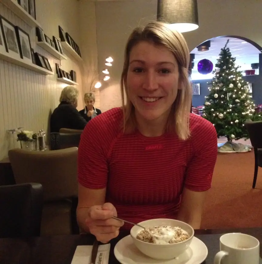 Slapen in een hotel betekent een uitgebreid ontbijtbuffet. Braaf poseer ik hier op de foto met een bakje kwark met müsli. Toen de camera uit was volgden natuurlijk de croissants, kerststollen en hele suikerbroden. Dat begrijp je natuurlijk wel! He he..