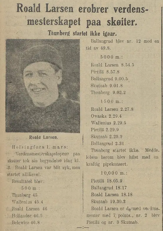 Nee, dan verging het Roald Larsen heel anders. De inwoner van Kristiania, het Oslo van nu, kwam begin maart 1924 naar Finland met een zak vol olympische prijzen die hij ruim een maand eerder tijdens de eerste Winterspelen ooit had verzameld. Het was een imposante oogst van een weekend schaatsen in Chamonix: zilver op de 1500 meter en dankzij de tweede plaats in het algemeen klassement over alle afstanden, en drie bronzen plakken (500, 5.000 en 10.000 meter). Goud volgde wat later, zij het dat het ‘slechts’ het Europees kampioenschap allround betrof. Op wat je bijna zijn eigen ijsbaan zou kunnen noemen – Larsen werd geboren in de straat waar het Frogner stadion stond – deed hij een geslaagde gooi naar de titel.