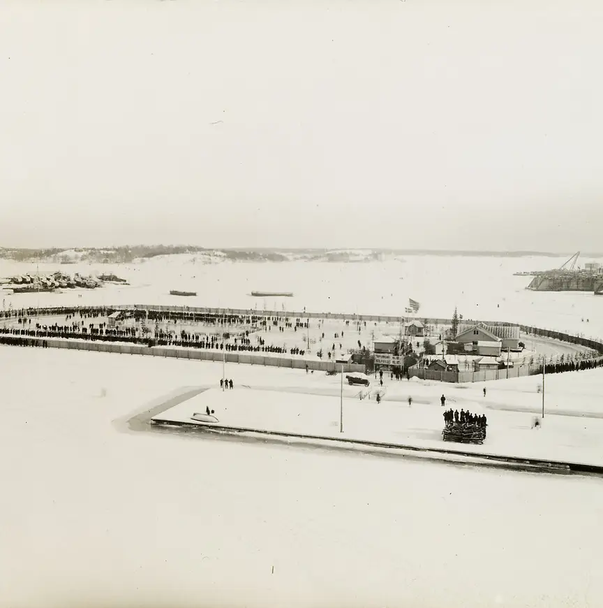 De honger bleek niet gestild, toen hij bij de bevroren arena van Pohjoissatama (foto boven) arriveerde voor zijn derde WK. In 1922 debuteerde hij op indrukwekkende wijze door als tweede te eindigen, achter landgenoot Harald Strøm. Het seizoen erop zat er geen podiumplaats in: Larsen moest drie man voor zich dulden, van wie er twee in ’24 verstek lieten gaan. De Fin Clas Thunberg echter, de grote gouddelver van Chamonix (drie keer, plus een zilveren en bronzen plak), gaf wel acte de presence en gold voor eigen publiek natuurlijk als de topfavoriet.