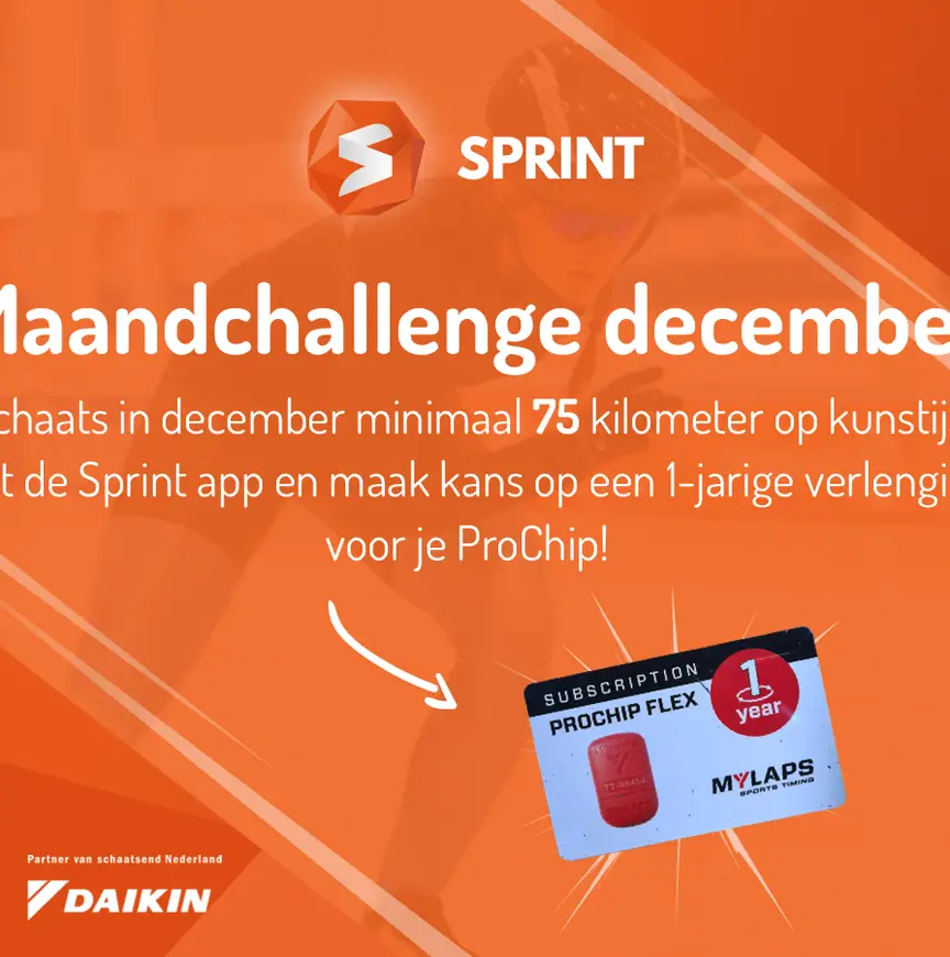 De challenge voor december en januari is: “Schaats in december 2021 en januari 2022 minimaal 75 kilometer op kunstijs met de Sprint app en maak kans op een 1-jarige verlenging voor je ProChip!”.