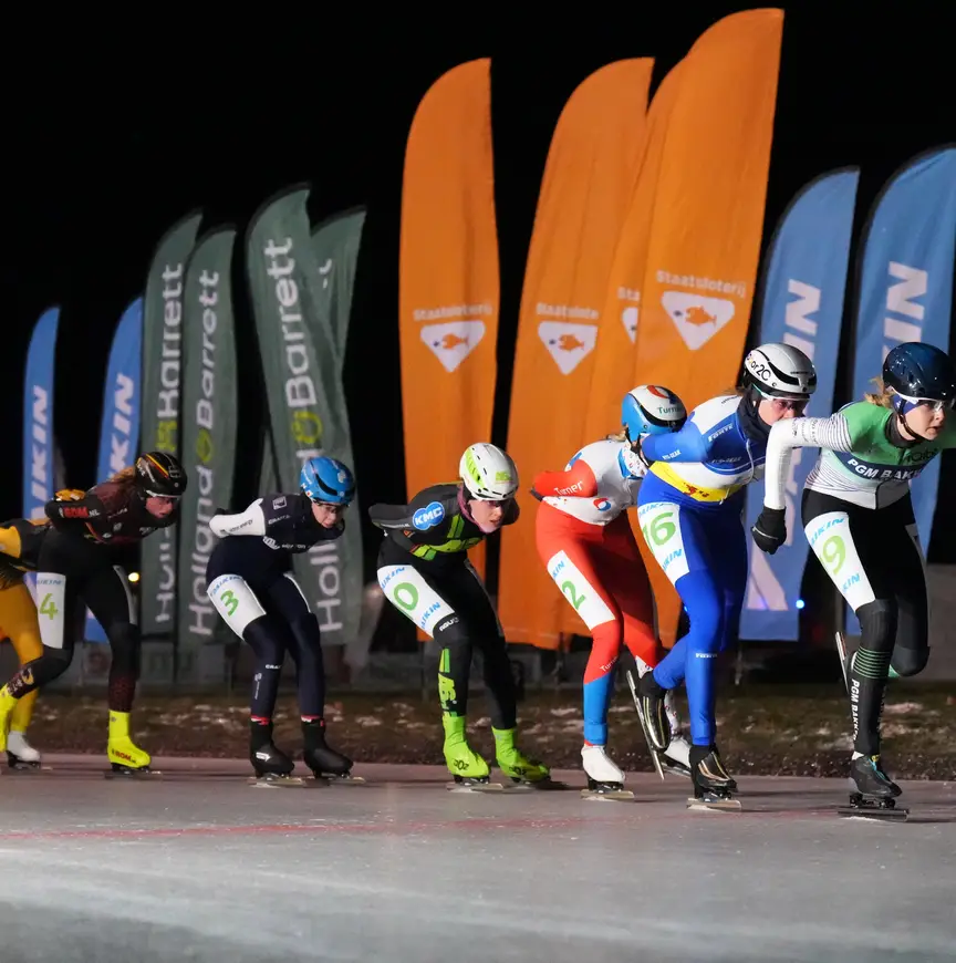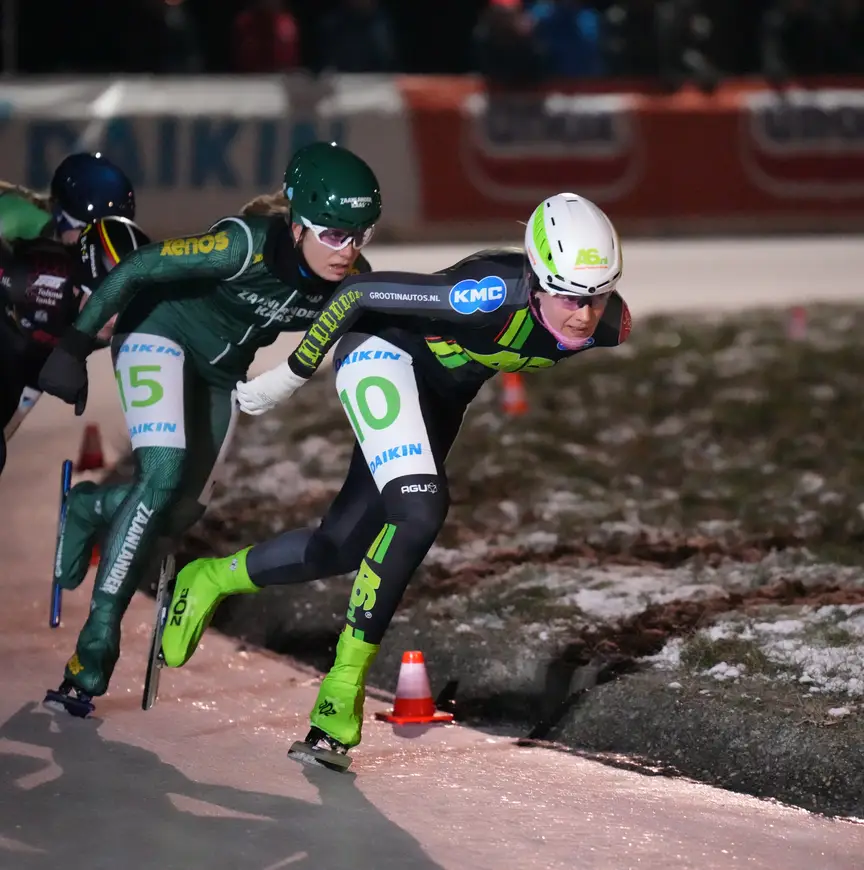 Nauta trekt ons mee de koers in. “Vanaf het begin ging de beuk erin. Het was een klein baantje met ruw ijs. Echt even anders dan Winterswijk, waar het bijna kunstijs was. Met een hele groep vrouwen op zo’n klein rondje is het chaos.” Hoewel Nauta, de Nederlands kampioene allround van 2014, haar sporen verdiend heeft op de langebaan, kon ze goed omgaan met de wisselende omstandigheden. “Ondanks mijn langere benen en mijn langere slag kan ik goed schakelen. Vandaag stelde ik me niet in op Albert Heijn Zaanlander, maar moest ik letten op Tessa Snoek. Zij was mijn ijkpunt.”