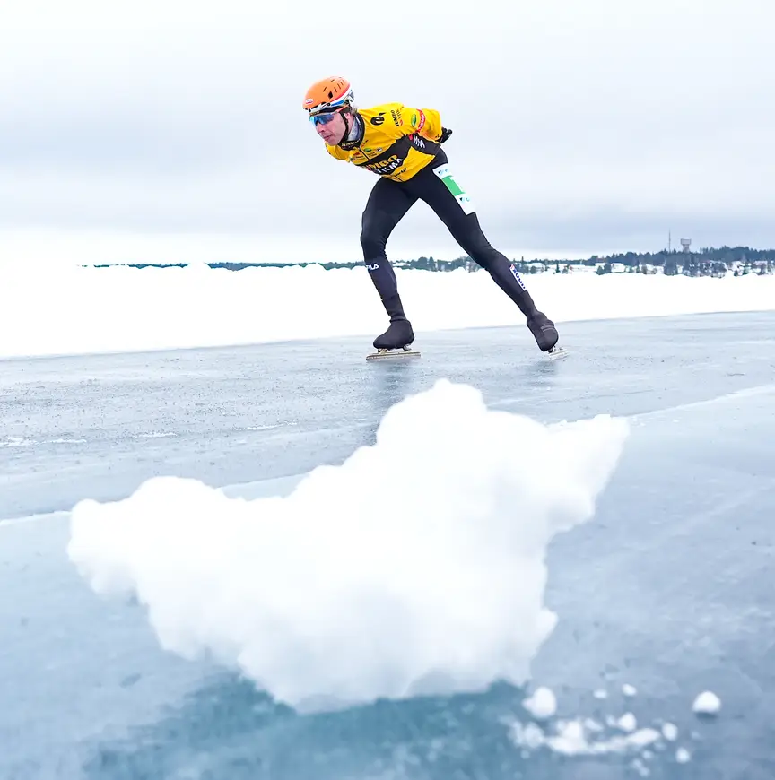 Hoewel de ijsvloer behoorlijk heeft te lijden gehad van de regenval, is Bergsma te spreken over de baan. “Over het algemeen is er prima op te rijden”, constateert hij na een kort trainingsritje. “Er zit een paar stukken in met sneeuw dat slecht is, maar dat weet je met natuurijs. De wind zal er meer voor zorgen dat het een zware wedstrijd kan worden. Om eerlijk te zijn heb ik er de jongste jaren niet veel ervaring meer mee, want de laatste races dateren van vijf jaar geleden, toevallig ook hier.”