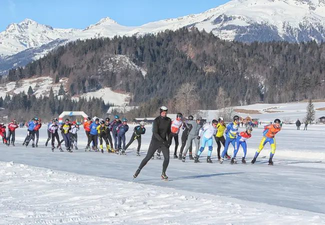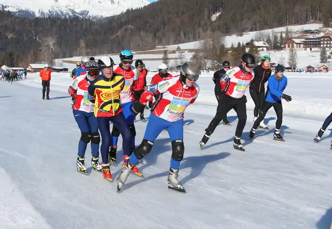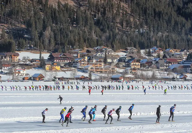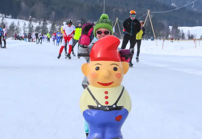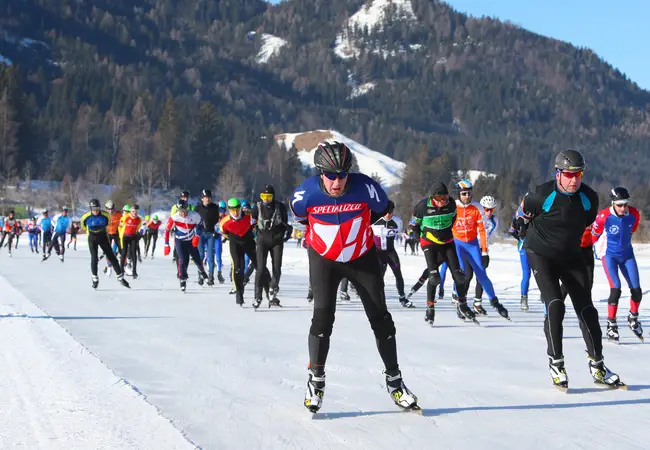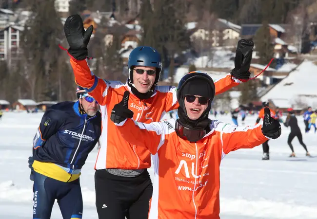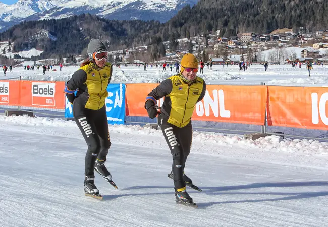 "Dit jaar hadden we weer afgesproken. Hans mailde mij om te vragen of ik weer naar de Weissensee ging", vertelt Rosalie. "We gingen allebei de derde toertocht rijden, vandaag dus. Vanochtend hadden we elkaar nog niet gevonden, pas na drie ronden kwamen we elkaar tegen bij deze verzorgingspost. Bij het wc'tje kwam hij naar mij toe en zei 'we gaan weer samen!'." De man van Rosalie schaatst ook de tweehonderd kilometer maar gaat net te hard voor haar om bij te houden. De vrouw van Hans staat als toeschouwer langs de kant met bananen. "Thuis hebben we er een grapje van gemaakt", zegt Hans. "Ik heb gezegd dat ik ging daten op de Weissensee." Ze schieten in de lach. "De date is gelukt! Volgend jaar gaan we weer", zegt Rosalie.