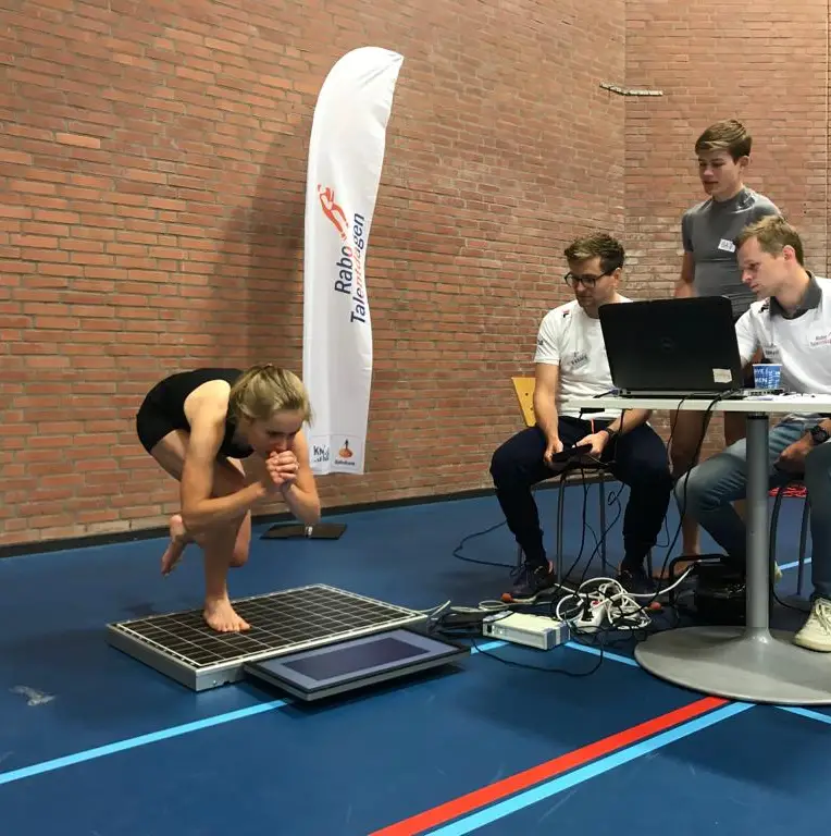 Voor een echte schaatser kan een goede sprongtest natuurlijk niet ontbreken. Explosiviteit en kracht zijn namelijk erg belangrijk om op het ijs snel uit de startblokken te gaan. De schaatser staat met elk been op een aparte plaat, zodat ook bekeken kan worden of er verschil zit in de mate waarin wordt afgezet. Gebruikt iemand het linkerbeen meer om af te zetten of is er juist een voorkeur voor rechts? De schaatsers doen zowel éénbenige als tweebenige sprongen en natuurlijk wordt ook de hoogte van de sprong gemeten.
