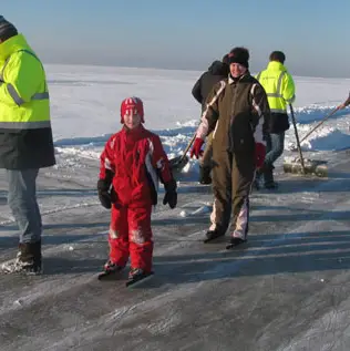Secretaris Gerke de Jong: “Dat kan, want het water is hier niet dieper dan zo’n 30 à 40 cm. De sneeuw gooide nog bijna roet in het eten en we hebben de anderhalve kilometer lange baan van vier meter breed dan ook met vele handjes moeten vegen, maar het is gelukt. En als de baan dan goed is, moeten bepaalde dingen ook meteen georganiseerd worden.”
