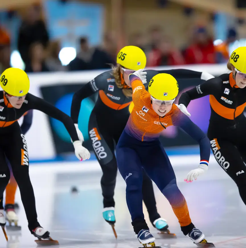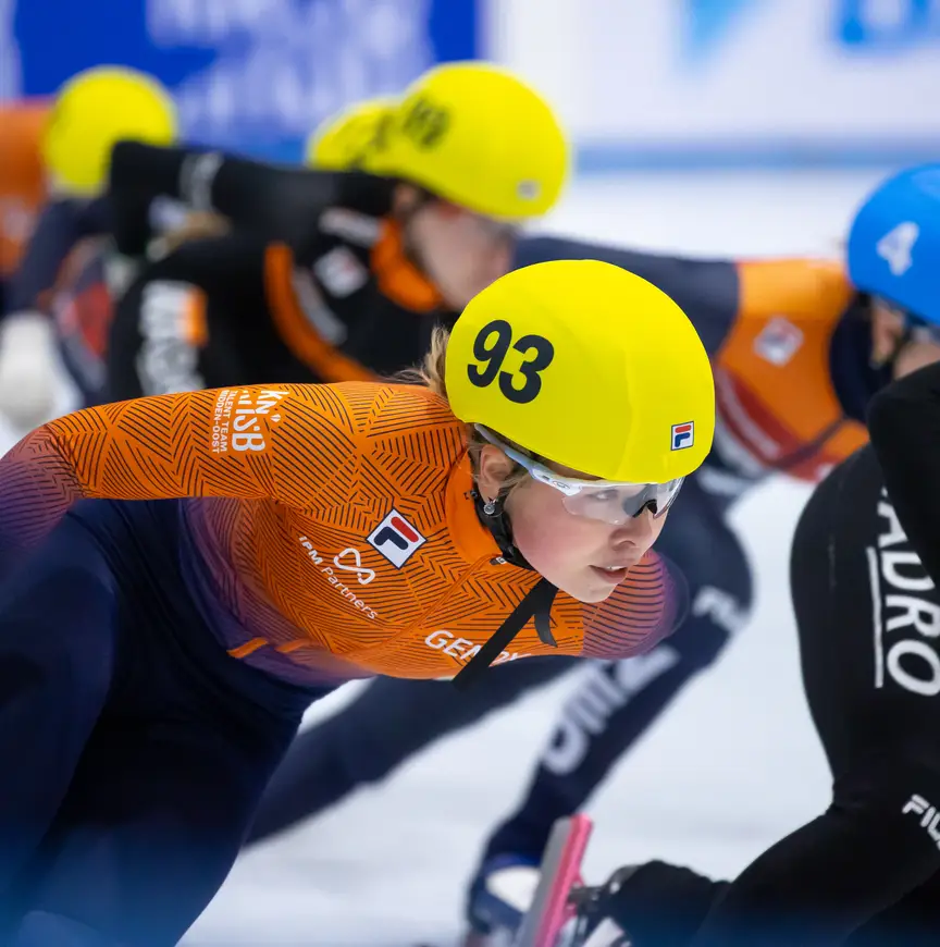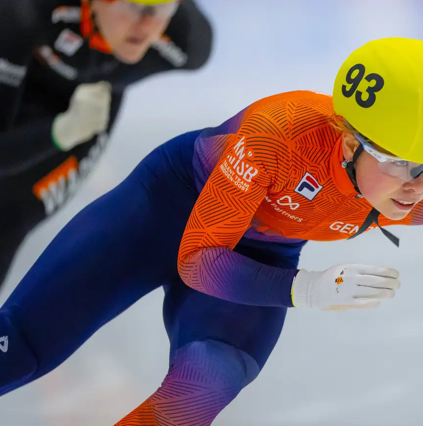 Van Oorschot vindt het prima. Zaterdag 14 oktober stapt ze in het vliegtuig naar Canada voor het volgende hoofdstuk van haar geweldige avontuur, dan heeft ze weer twee weken hetzelfde bed. De knappe prestaties in het drieluik time trials, het Daikin NK en de Dutch Open van afgelopen maand hebben haar een plek opgeleverd in de groep die de World Cups rijdt. Dat is ‘heel vet’, ‘supergaaf’, maar net zo goed een dikke beloning voor haar doorzettingsvermogen. Minder dan een jaar terug (5 november 2022) knalde ze loeihard tegen de boarding van de ijsbaan in Bormio: de crash – met een whiplash en veel langdurende narigheid tot gevolg – hield haar geruime tijd aan de kant. Ondanks de blessure was ze begin dit jaar van de partij op het WK voor junioren in Dresden (met een vierde plaats op de relay voor vrouwen). “Verder verliep dat toernooi niet helemaal goed voor me. Ik kreeg een flinke terugval waardoor ik opnieuw moest beginnen. Pas in juni van dit jaar mocht ik weer alles doen.”