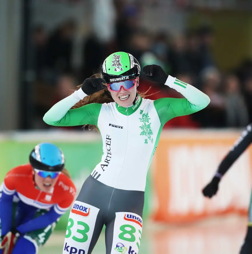 De ontknoping van de strijd om de nationale titel bij de Junioren A was spannend. Twee vluchters, vier achtervolgers, en die zes kwamen samen op het laatste rechte stuk. In die chaos hield Dieuwertje van Kalken het hoofd koel. "Het was een beetje shorttrack", zei ze over de actie waarmee ze naar de winnende positie 'stapte'. Alleen dan wel shorttrack zonder penalty, maar mét een mooie beloning. "Ik moest even om meiden heen, en bij anderen binnendoor. Vervolgens kon ik zo naar de finish", vertelde de 19-jarige schaatsster uit het Noord-Hollandse Hem.