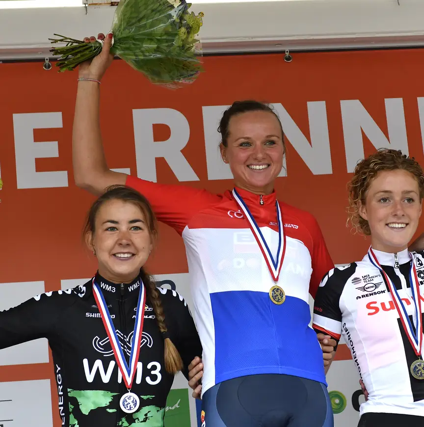 "Kopgroep. Bij het NK kwam ik ongeveer na zestig kilometer in een kopgroepje met in eerste instantie vijf rensters. Uiteindelijk bleven we met z'n drieën over. Ik voelde me heel goed en we werkten goed samen. In de laatste vier kilometer maakte ik een paar kleine cruciale foutjes waardoor ik geen kans meer maakte om te winnen. Maar het was wel een mooie koers. Solo aankomen, zoals ik deed in Gent-Wevelgem (in 2015) is helemaal een mooi gevoel. Dat is nog mooier dan in een kopgroep aankomen."