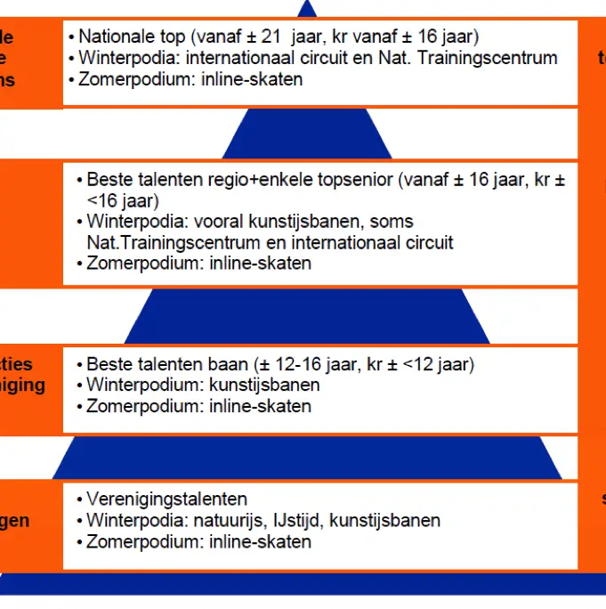 Deelname aan het programma van een RTC is weggelegd voor talenten die eerst op hun vereniging en daarna in de baanselectie (het gewest) hebben laten zien dat ze klaar zijn voor een stap hogerop. De KNSB stimuleert centra samen te werken met enerzijds deze verenigingen en baanselecties en anderzijds de Nationale Teams/topteams. Het uiteindelijke streven is dat talenten soepel doorstromen naar dit hoogste niveau. De Nederlandse juniorenselectie, die deelneemt aan internationale wedstrijden, heet nog steeds Jong Oranje. Op de afgelopen WK Junioren in Helsinki behaalde de ploeg twintig medailles en negen titels.