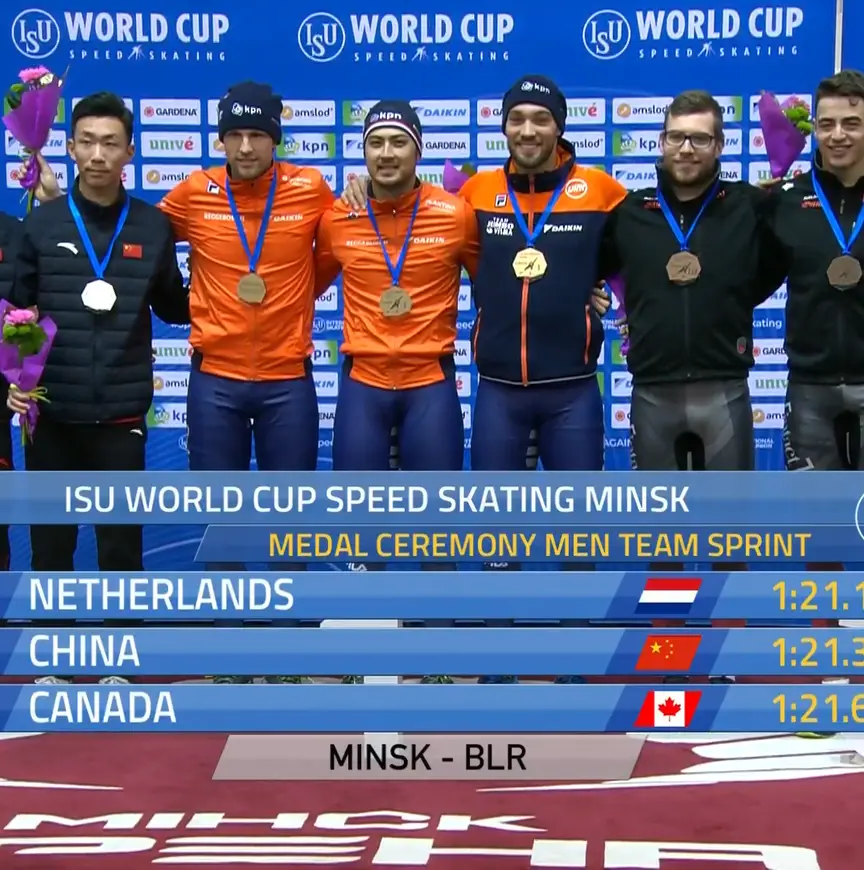 Ook de mannen sprintten op het teamonderdeel naar de winst, maar het verschil met de nummer twee was klein. Ronald Mulder, Kai Verbij en Kjeld Nuis waren met een tijd van 1.21,16 'slechts' 0,15 seconden sneller dan de verrassende Chinezen. Canada eindigde een halve seconde achter Nederland en eindigde als derde. Mulder, Verbij en Nuis pakten afgelopen februari goud op dit onderdeel bij de WK Afstanden.