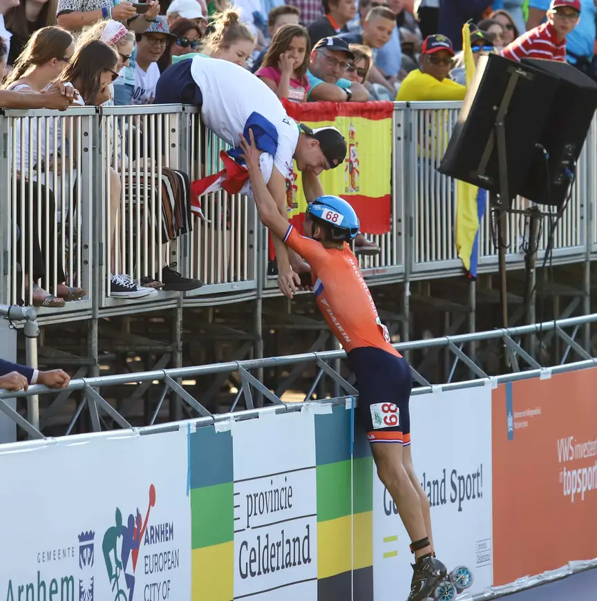 "Wat een bizarre dag", reageert een nog enigszins verbaasde Scheperkamp. "Het was een gekkenhuis. Je zit zelf in een tunnel van 200 meter, maar hoort wel al die mensen op de tribunes die je aanmoedigen. Kippenvel." Zijn serie op de afvalkoers ging (letterlijk) niet zonder slag of stoot. Met een derde plaats verzekerde de Hilversummer zich van een plek in de finale, maar hij verliet het strijdtoneel met een bloedneus. Oorzaak: twee vuistslagen in het gezicht.
