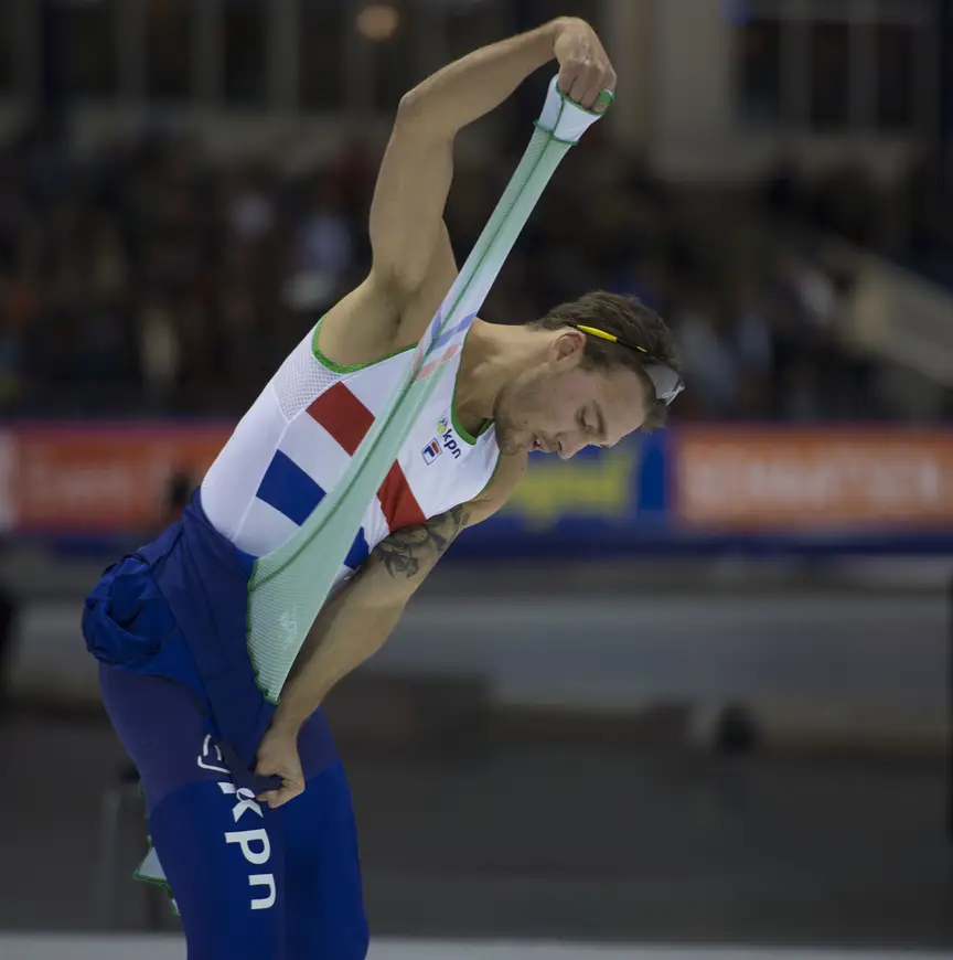 Schaatspakken. De kwaliteit wordt steeds beter, maar erg comfortabel zitten ze duidelijk niet. In ieder geval dat van Kjeld Nuis. Het uittrekken van zijn pak kostte de rijder van TeamNL-Jumbo op het oog meer moeite dan om twee 1000 meters te winnen. Als kauwgom plakte het aan zijn lichaam blijkt uit de onderstaande foto.
