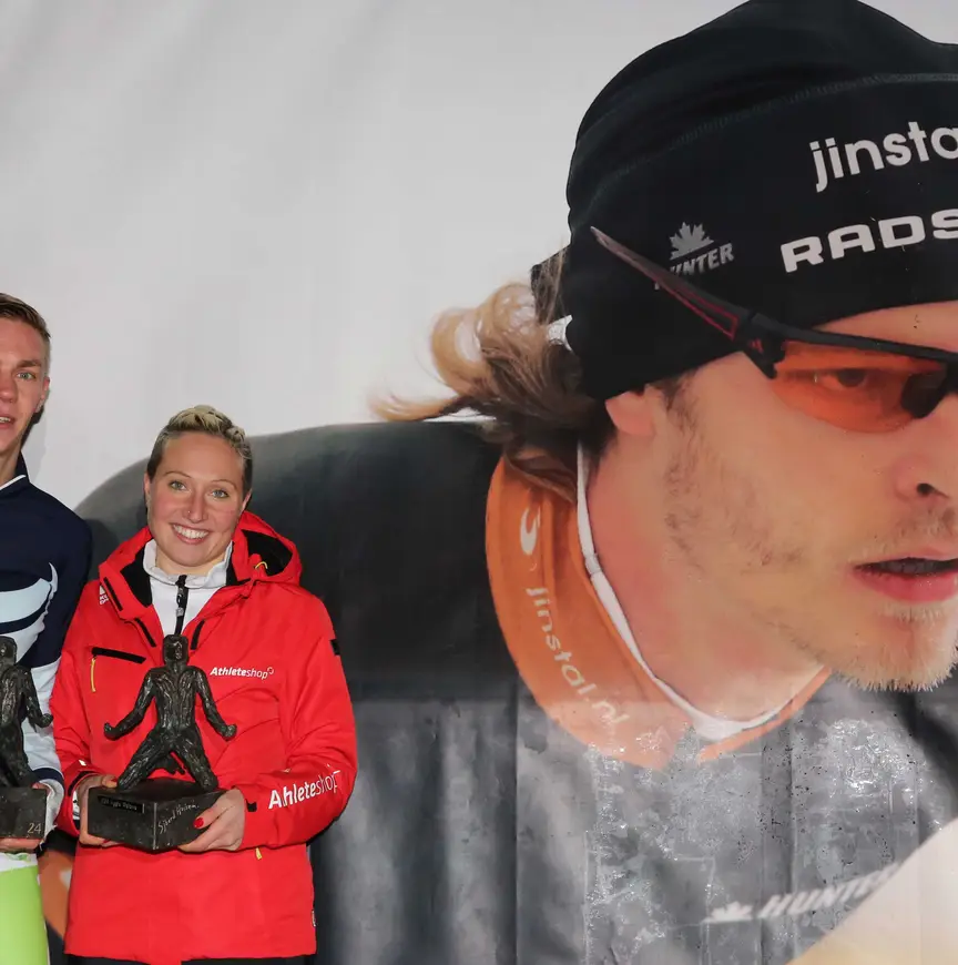 De KPN Marathon Cup in Hoorn was niet zomaar een wedstrijdje. Er werd gestreden om de Sjoerd Huisman Bokaal, ter nagedachtenis aan de veel te vroeg overleden marathonrijder. Het is niet voor niets dat fotografe Neeke Smit de winnaars Swings en Lollobrigida het beeld laat delen met de levensgrote foto van Huisman: het was ook een beetje zijn wedstrijd.