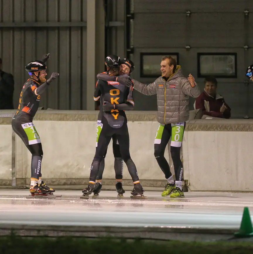 Nog even terug naar de marathon in Breda. Frank Vreugdenhil won nadat ook zijn ploeggenoten een sterke prestatie leverden. De winnaar betrok zijn teammaten na afloop dan ook volop in de feestvreugde.