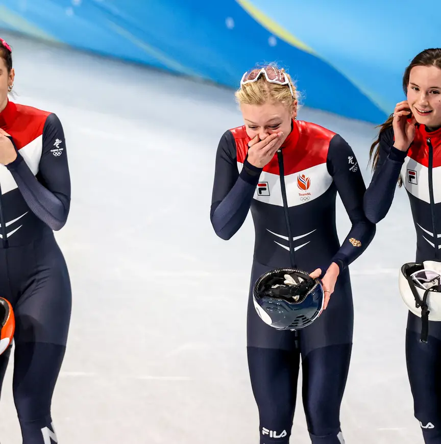 Vanzelfsprekend betrok Van Kerkhof (31) onmiddellijk haar in juli 2020 overleden hartsvriendin Lara van Ruijven in het prachtsucces van het kwartet. Vlak voor ze het ijs op moest, wreef ze bewust met een hand over het panterhartje dat op alle pakken van de shorttrackers is gedrukt als aandenken aan Van Ruijven. “Daarbij zei ik een paar woorden tegen haar: Laar, geef ons kracht. Ik vind het mooi om er zo bij stil te staan Het is ook dankzij haar dat we hier nu als de winnende formatie staan. Zij heeft ons op dit niveau gebracht en daarom voelt het alsof ze hier bij ons is.”