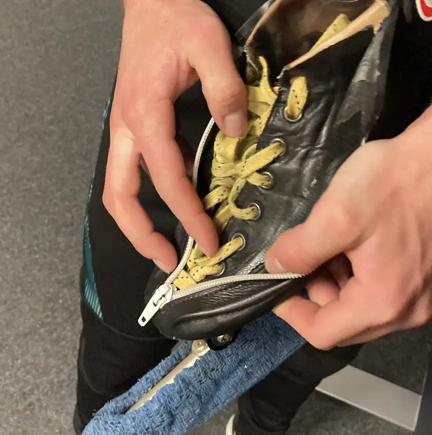 Hij pakte een schaats op die voor hem op de grond lag. Door de hoes die het veterwerk verbergt opzij te trekken, werd een enorme scheur zichtbaar in het leer. Wierda stak er zijn vinger do doorheen. “Logisch dat ik niet meer zo hard reed de afgelopen maand: ik kon m’n kracht niet kwijt. Die schoen wilde niet, ik merkte wel dat er iets niet goed was, maar het moet eerst een klein scheurtje zijn geweest dat gaandeweg steeds groter is geworden. Vanmorgen zag ik het ineens bij het aantrekken van mijn linkerschoen. Die kon Kip Carpenter (materiaalcoach van de nationale shorttrackselectie, red.) repareren. Alleen wist ik op dat moment niet dat mijn rechterschaats er net zo aan toe was. Achteraf zeg ik: heel frustrerend. Want ik ben best wat trainingen zonder een goed gevoel begonnen.”