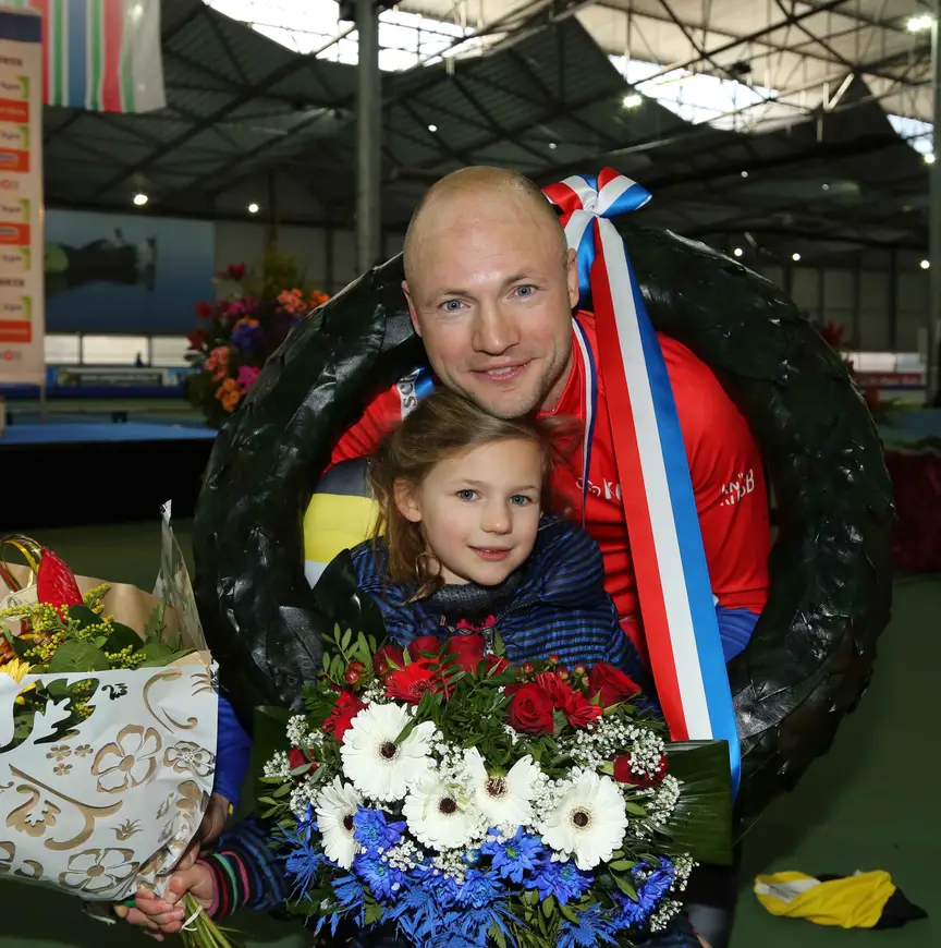 Even werpt hij een trotse blik op de krans om zijn nek. ’’Ik schaats al vanaf mijn zestiende. Werd ooit nog Nederlands kampioen bij de studenten. Daarna heb ik nog best goed gereden als sprinter en uiteindelijk koos ik voor wielrennen. Daar heb ik ook nog vier klassiekers gewonnen. Maar dit, dit is mijn eerste echte titel. Zo voelt het absoluut. Daarom ben ik er ook ontzettend blij mee.’’