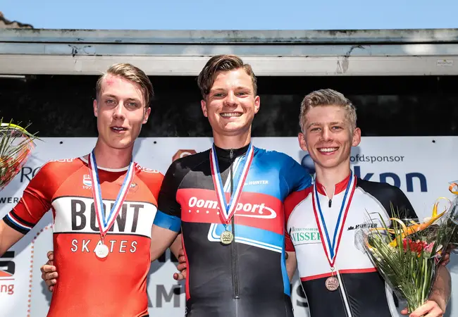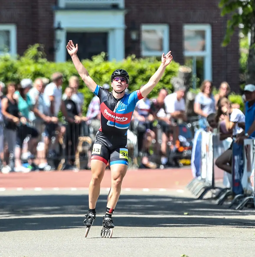 De kersverse kampioenen mogen voor een ereronde plaatsnemen in een cabrio. Met hun medaille om de nek, bloemen in de hand en skeelers op de achterbank genieten de junioren van hun laatste rondje over het 1450 meter lange parcours in Waarland. "Heel bijzonder", glundert Maaike Verweij. Op een stoeltje langs de kant is ze even later bezig haar skates te verruilen voor gympen. Toeschouwers feliciteren de 17-jarige rijdster uit Veenhuizen met haar overwinning.