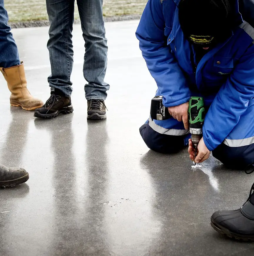 Dat deze banen na één nachtje vorst de deuren kunnen openen ligt aan de ondergrond van de banen: beton. Gedurende de nacht is er op de betonvloer laagje voor laagje water aangebracht. En omdat er onder het ijs geen water ligt, hoeft de ijsvloer ook veel minder dik te zijn dan op water.