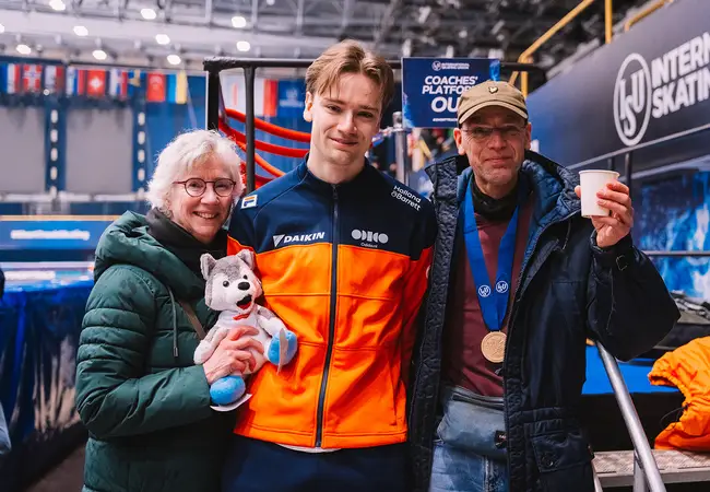 Dergelijke zorgen bereikten zijn teammaat Kay Huisman toen nog niet. De lange, super afgetrainde Westlander zocht zijn ouders Feikje en Erik die het weekend als ingetogen meelevende supporters op de tribunes van Hala Olivia te vinden waren geweest. Kay zei niet veel. Onderhuids moest er veel emotie verborgen zitten op deze in meer opzichten speciale dag. Het lag namelijk niet in de lijn der verwachtingen dat hij vaker in het bijzijn van de mensen aan wie hij zijn steeds verder ontluikende schaatscarrière heeft te danken, zulke successen zal vieren.