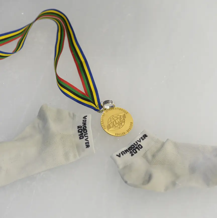 Van de Olympische Spelen heb ik nog altijd het kledingpakket. De sokken waren het meest bruikbare stuk uit het kledingpakket en die heb ik nog heel vaak aan. Ze zitten goed strak en hebben precies de goede hoogte. Op het randje staat Vancouver 2010. Ze doen het nog steeds, zonder gaten. Een setje ging wel een beetje kapot bij de tenen, maar die heb ik toch stiekem even bij elkaar genaaid."
