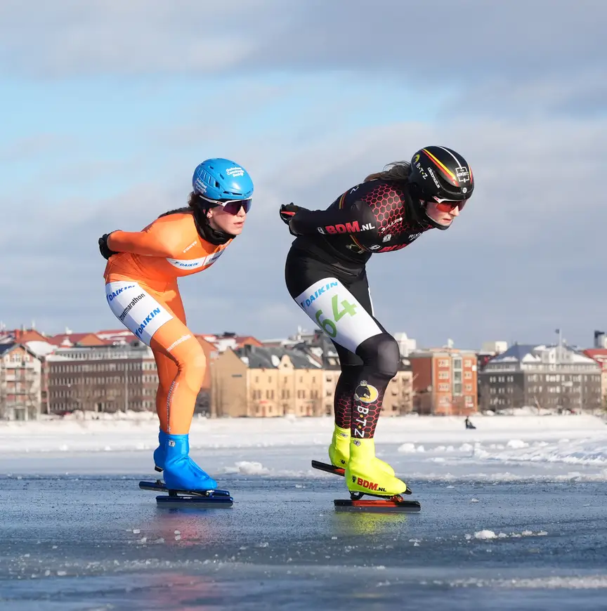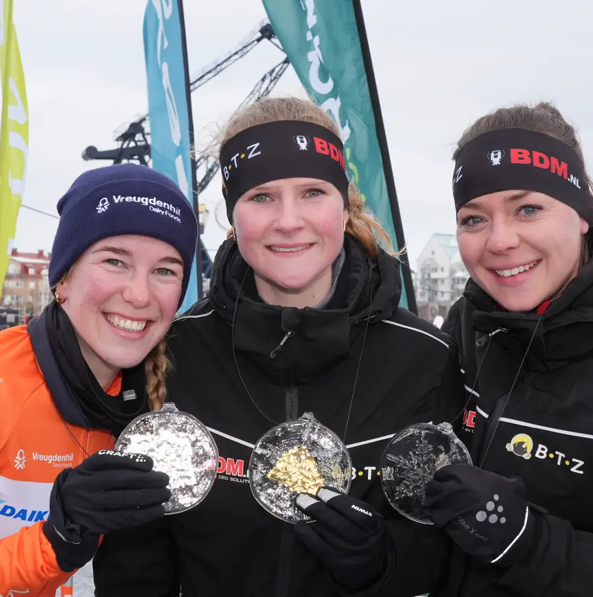 Die versnelling kwam uit de benen van de zeer actieve Kiel. Toen ze omkeek, zag ze slechts het verhitte hoofd van Snoek achter zich: doorrijden derhalve, want achter haar zou de rest van het zwarte leger de situaties onder controle houden. “Dat spel hebben we met z’n vieren uitstekend gespeeld”, was de terechte conclusie later. Kiel moest nog een karwei naar behoren afronden: Snoek kloppen in de sprint met twee. Ze was er niet bang voor geweest. “Naarmate de streep naderde hoorde ik dat Merel op komst was. Ik vertelde dat tegen Tesssa door te zeggen dat ik niet meer zou meerijden. Heel lullig voor haar, maar zo werkt het dan”, sprak Kiel, die na winst in twee kunstijswedstrijden nu de eerste op natuurijs binnen heeft.